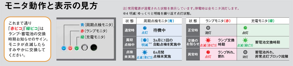パナソニック みるだけバッテリー 長期間消灯を継続するなどによって、法定点検の期間である6ヵ月間点検未完了の場合は、青色の周期点検モニタ(※3)が点滅して点検未実施をお知らせ。